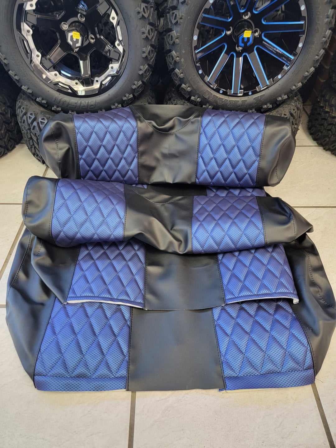Custom Diamond Stich Black & Blue Seat Covers Ez-Go (Ezgo) Txt/Rxv 1996-Current) or Club Car DS (2000-2013) Includes Both Front Rear Seat Covers